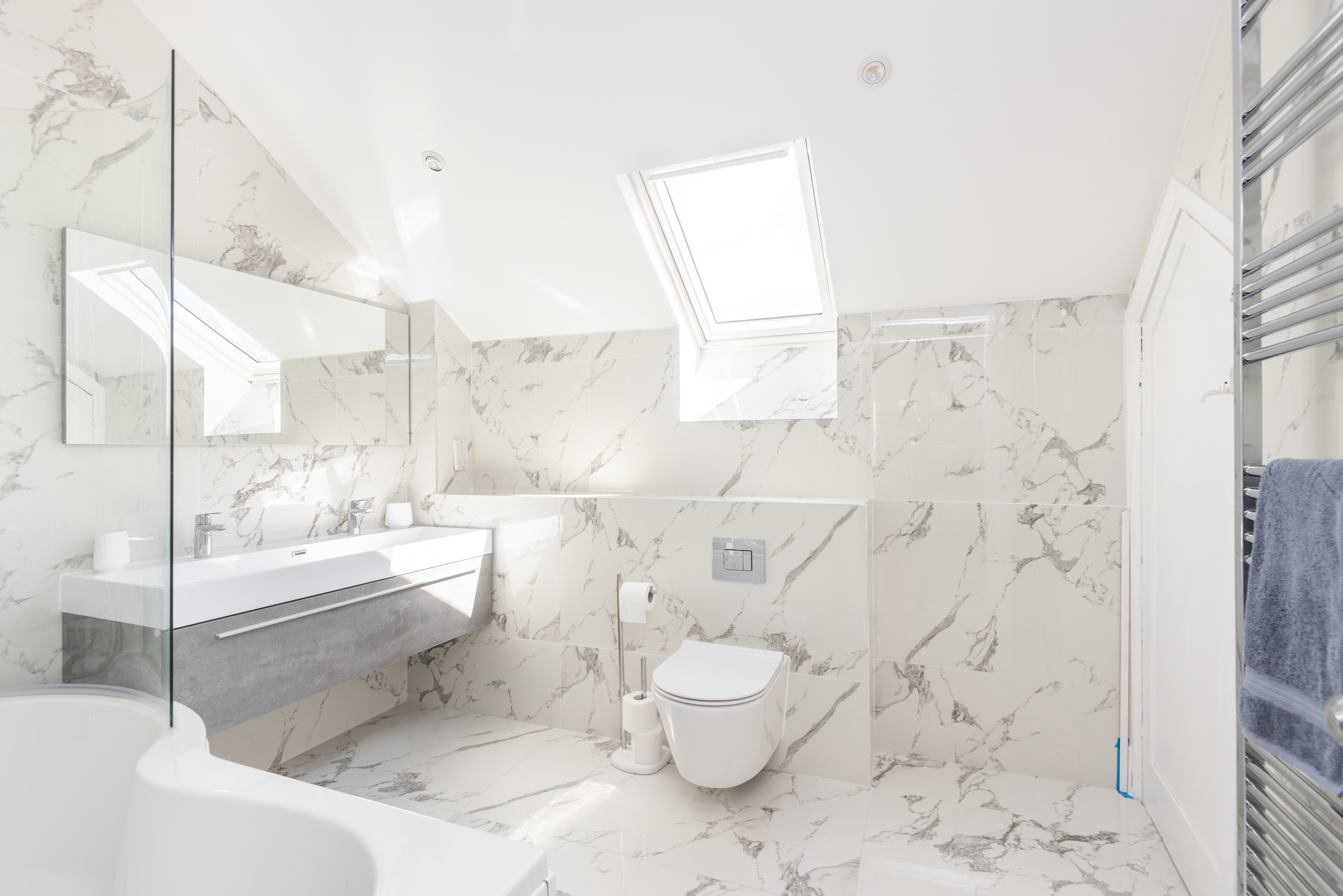 Family bathroom with bath and shower over, WC, large hand basin and heated towel rail. This bathroom may be accessed from both the communal living area and from the master bedroom.