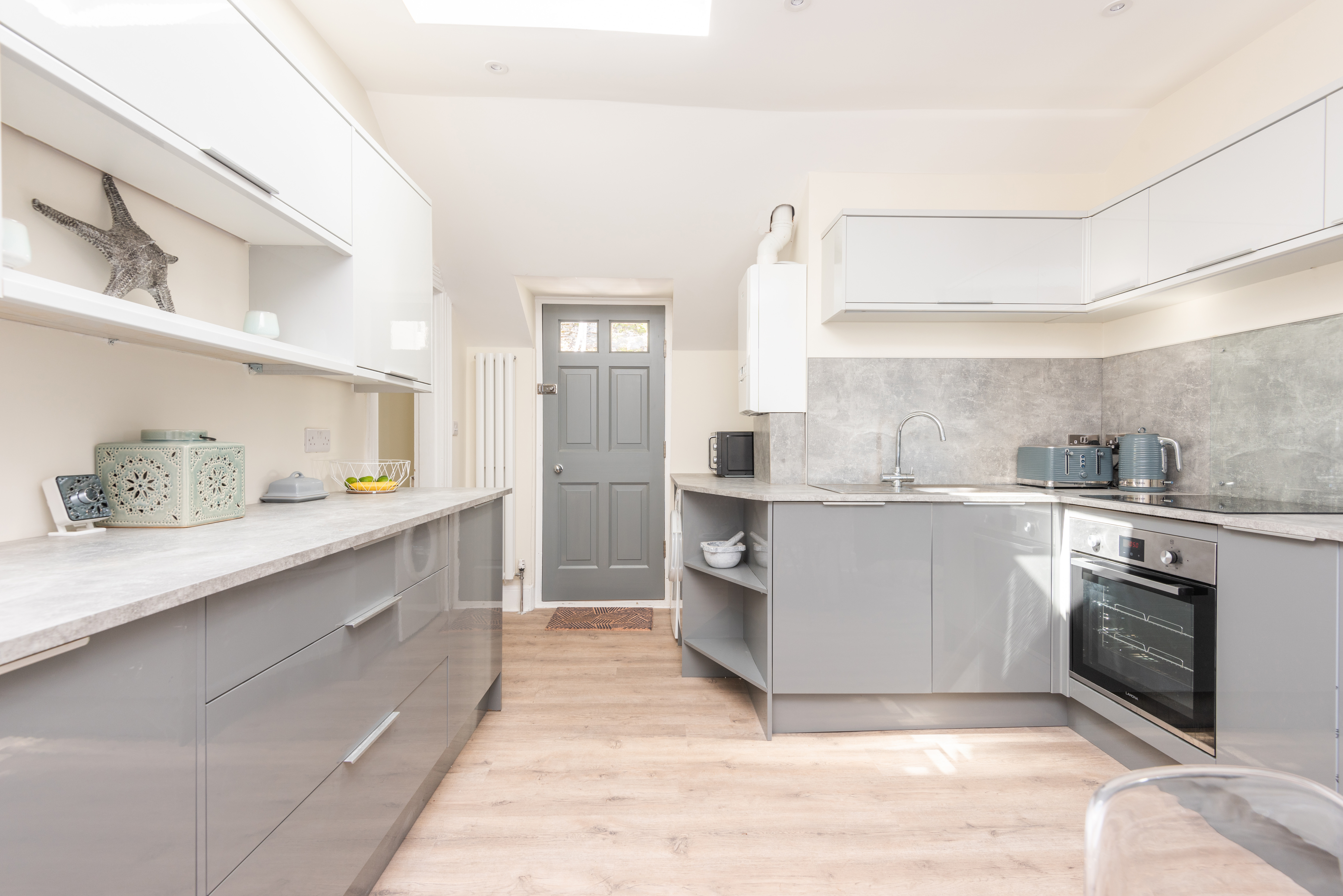 Kitchen with inset electric hob and oven, fridge/freezer, washing machine, dishwasher, microwave, kettle and toaster.